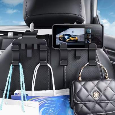 Adjustable Car Headrest Hook with Phone Holder – Multi-Functional Backseat Organizer for Front & Rear Seats, Durable Plastic, Round Shape, No Battery Required