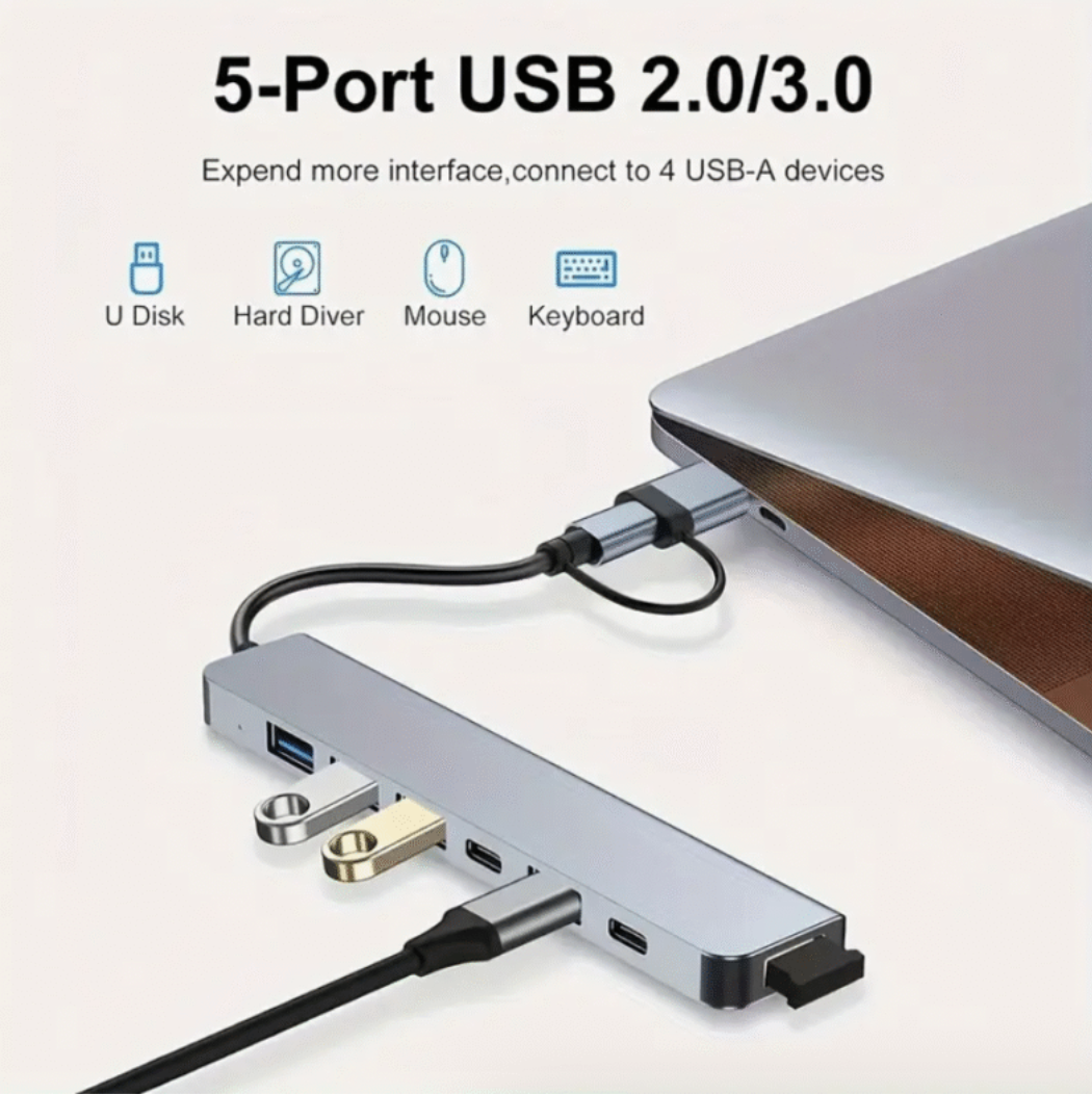 Equipped with multiple USB 3.0 ports, USB-A, and Type-C connectors, this adapter allows you to connect multiple devices simultaneously — such as keyboards, mice, flash drives, external hard disks, and more.